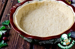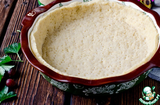 Достать тесто из холодильника и раскатать его в круг, выложить его в смазанную маслом форму диаметром 28-30 см., сделав бортики.