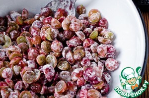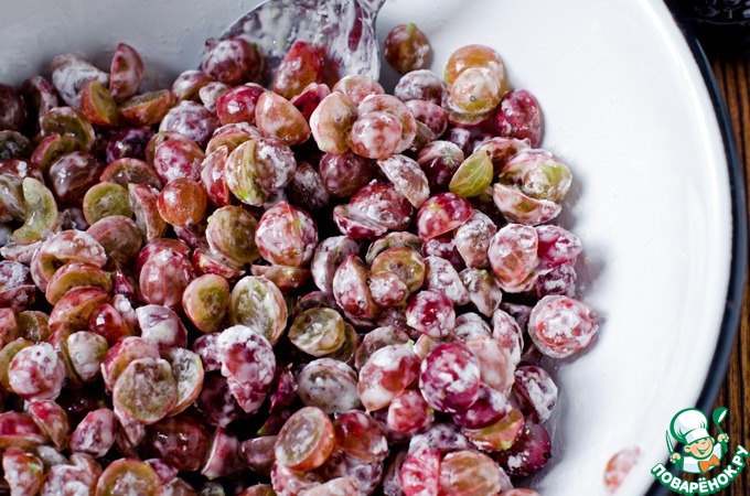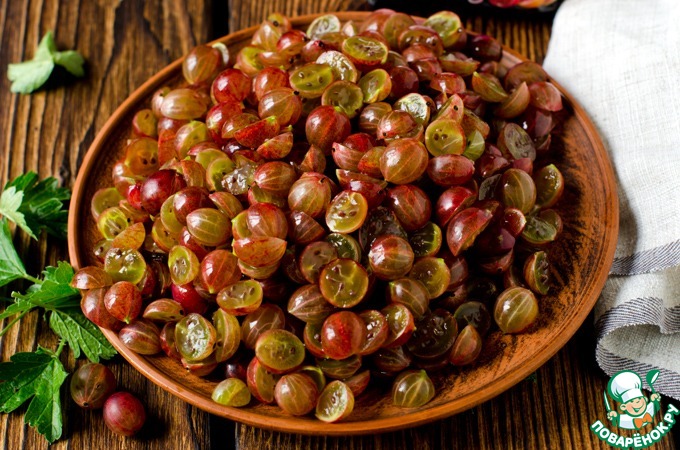 • Крыжовник вымыть, удалить плодоножки, хвостики и разрезать пополам.