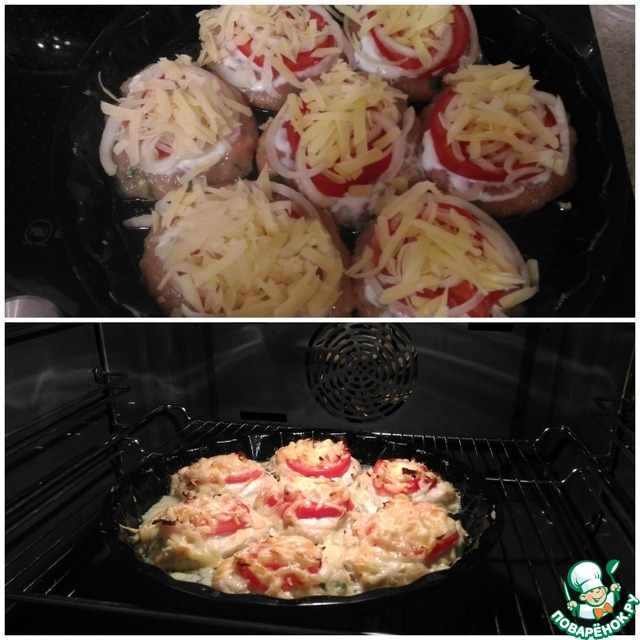 Порезать помидоры кружочками, репчатый лук колечками. На каждую котлету выложить по кружочку помидора и колечки лука, слегка присолить