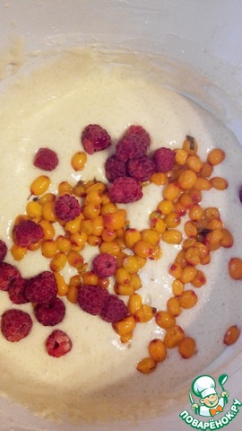 • Соединяем жидкие и сухие смеси при помощи венчика и добавляем облепиху и малину. Хорошенько перемешиваем тесто.