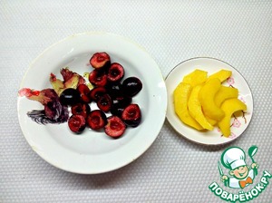Из черешни аккуратно удалить косточки, с персика снять кожицу и удалить кость.