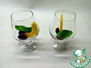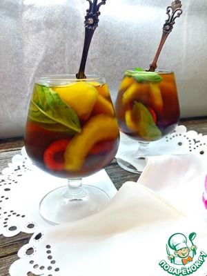 В бокал или другую формочку для желе сложить ягоды и фрукты, перекладывая листиками базилика или мяты.