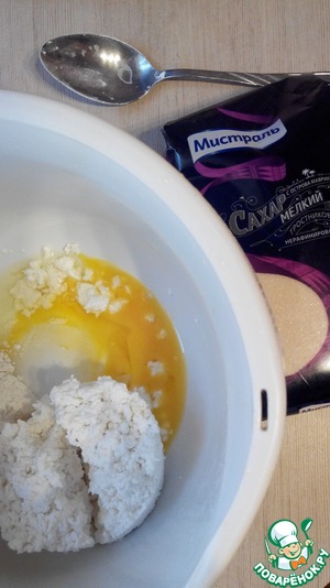 Хорошенько смешиваем творог, яйцо, щепотку соли, муку и 2 ст. л. сахара. Сахар мелкий ТМ Мистраль.