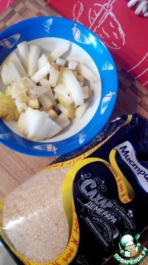 Грушу чистим от семян и режем кубиками, смешиваем с 2 ст. л. коричневого сахара. Сахар у меня демерара ТМ Мистраль. Идеальный для начинки, придает приятный карамельный вкус.
