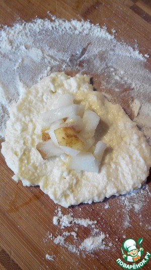 На присыпанном мукой столе делаем лепешку из теста. Можно скалкой, мне проще влажными руками. Выкладываем в центр начинку, края теста загните внутрь к середине.