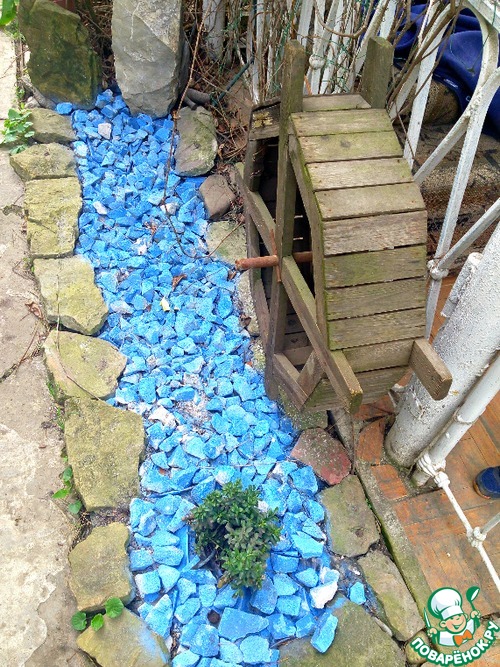 Наша дача - любимое место моей мамы, сюда она сбегает от городской суеты и общения с людьми (приходится очень много общаться по работе), чтобы побыть в тишине. А еще, чтобы любоваться дачей, у мамы множество идей. Например, сухой ручей с "водяной мельницей"