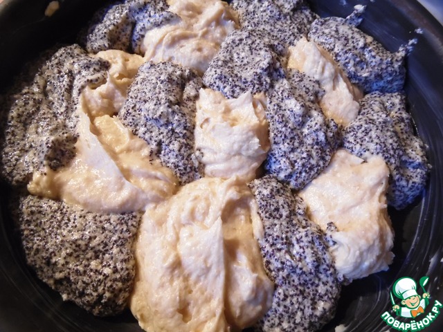 В смазанную сливочным маслом круглую форму для запекания (диаметр 22 см.) чередуя, рядом, выложить оба теста (1 ст. л. обычного, 1 ст. л. макового). Слегка разровнять.