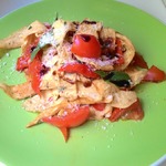 Яичные блинчики нарезать полосками шириной 1 — 1,5 см и выложить в сковороду к овощам, посыпать базиликом. Перемешать осторожно, чтоб не разломились "тальятелле". Выложить на тарелку, украсить листиками базилика. Приятного аппетита!