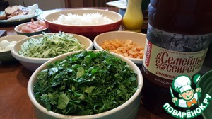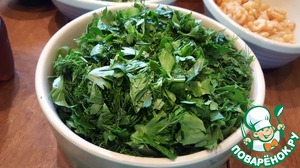Собираем в тарелку окрошку. Зелень. Много зелени.