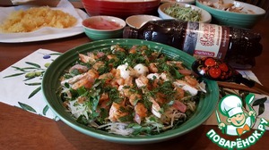 Полнейшее хулиганство!!! Картофель пай, жареная курица, креветки, дайкон с огурцами на тёрке для корейской моркови, перепелиные яйца и пастрома из индейки, а также традиционные зелень и квас!!! Угощайтесь!!!