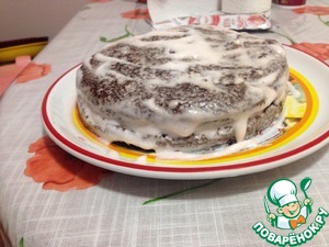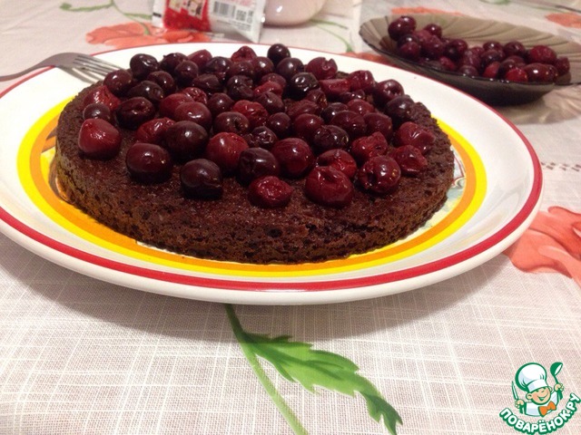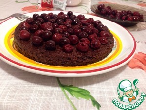 Теперь достаем наш чудесненький корж, даем ему остыть и выкладываем на него вишенку, затем делаем еще один коржик, даем ему остыть и на вишенку ставим еще один черненький корж. Кисточкой обмызваем наш тортик кремом, если есть время можно поставить в холодильник настояться и пропитаться вишенкой.