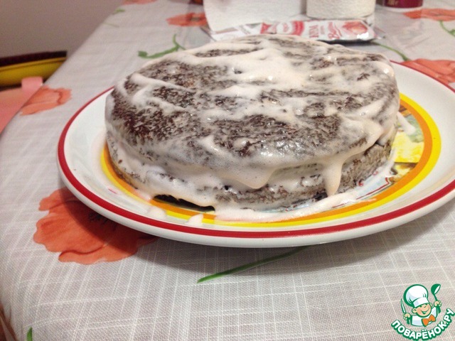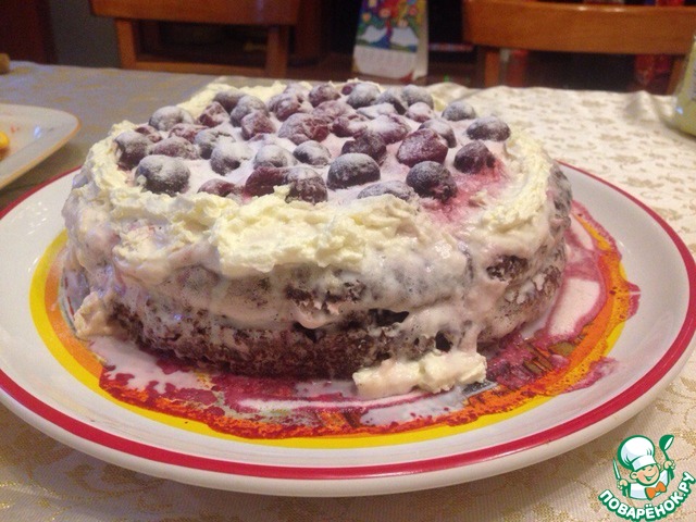 Я ставила торт на ночь, утром доставала и выкладывала еще раз вишенку, вокруг полила сливочками и посыпала сахарной пудрой.
