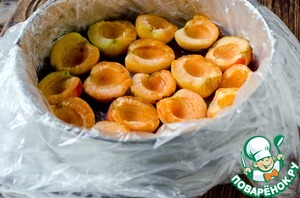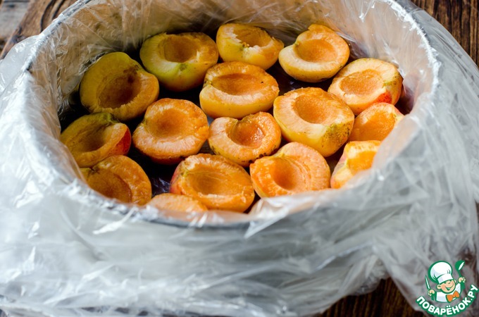 Форму для выпечки выстелить пленкой и уложить на дно дольки абрикосов.