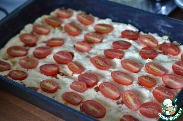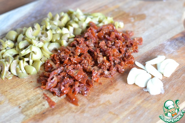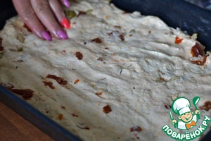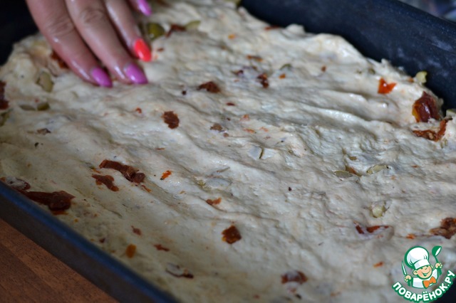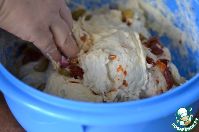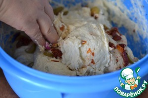 В подошедшее тесто добавить вялные помидоры и оливки.