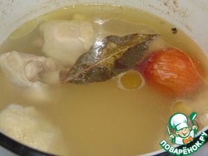 После закипания, сняла пенку, добавила соль, перец, лавровый лист и целую, не очищенную луковицу (для цвета и прозрачности).