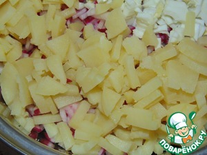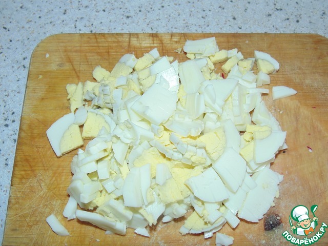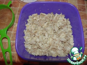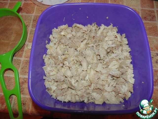 Мясо разобрала, мелко порезала и добавила тертый чеснок.