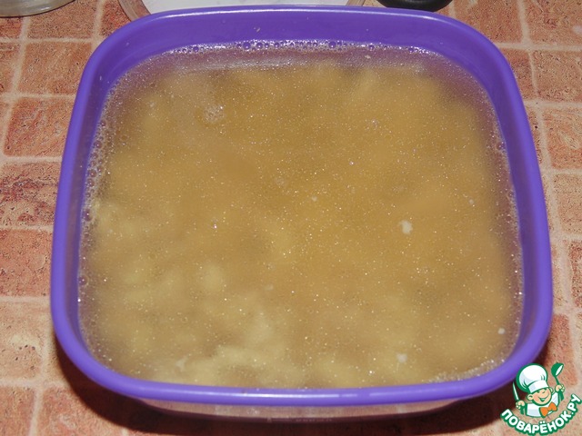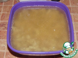 В горячий бульон добавила набухший желатин, хорошо размешала и залила им мясо.