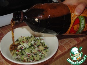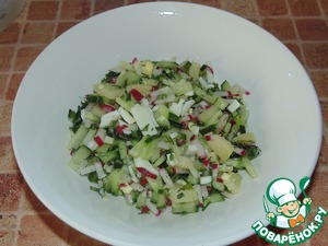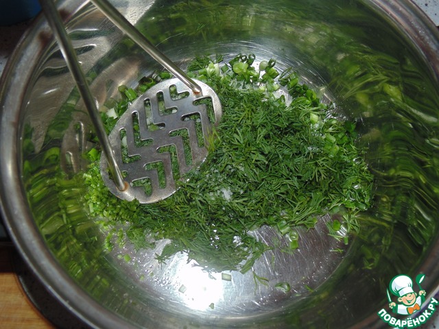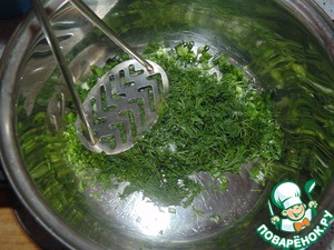 Лук и укроп мелко порезала, посолила и помяла "толкушкой".
