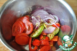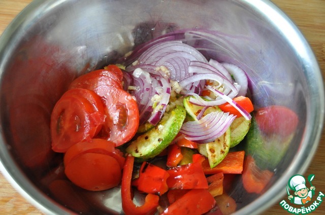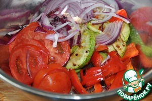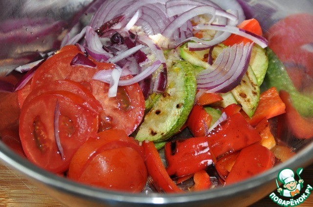 К овощам гриль добавляем нарезанный тонкими полукольцами красный лук и кружками помидор.