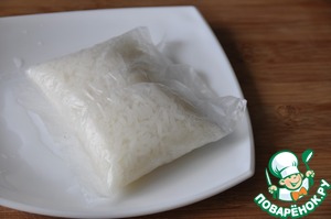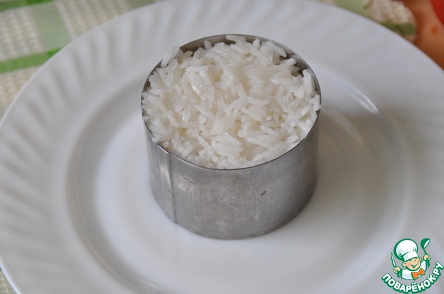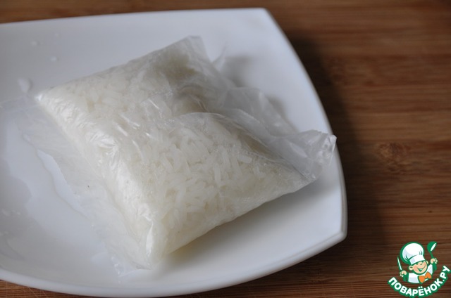Надрываем пакетик, кладём рис на блюдо (тарелку) в сервировочное кольцо.