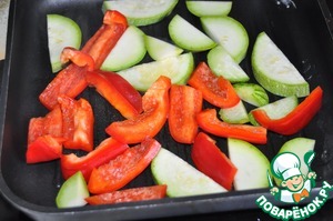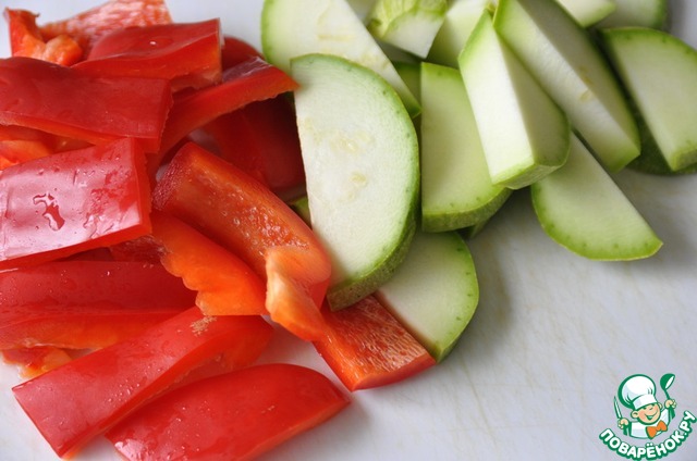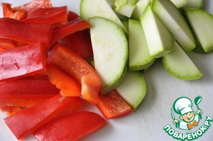 Цуккини режем полукольцами толщиной 7 мм, перец - крупными полосками. -
