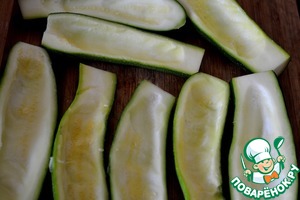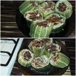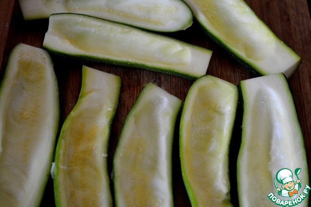 Кабачковый "лодочки" плотно фаршируем рисовой семью с сыром и зеленью. Плотно укладываем в толстостенную сковороду с маслом.