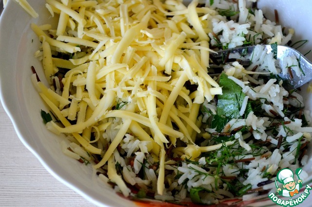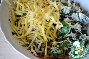 Смешиваем рис, зелень, чеснок, тертый сыр, солим по вкусу.