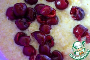 Все смешиваем (пшено и йогурт с яйцами и сахаром), добавляем вишню.