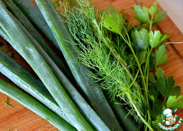 В это время нарезаем лук репчатый и свежую зелень. Вот такую я нарвала на грядках под окном