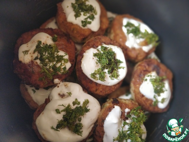 На каждую тефтельку кладем сметану, нарезанный укроп. Добавляем в сковороду примерно стакан кипятка и тушим тефтели под крышкой 15 минут.