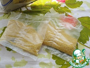 Пшено от Мистраль варится 25 минут, поэтому его мы поставим вариться в первую очередь, положив пакетики в горячую воду.