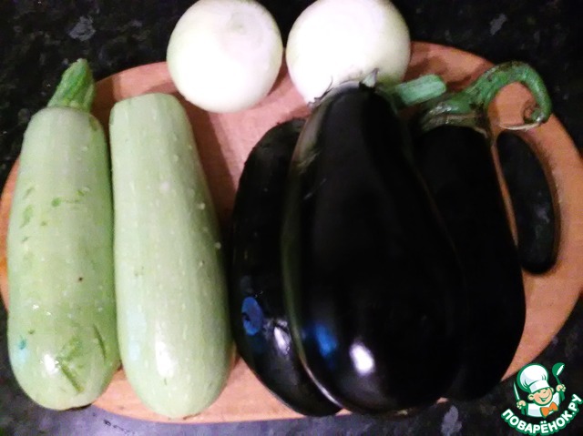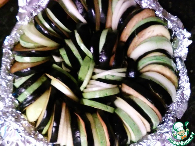 Баклажан и кабачок пустили сок. Удаляем его. В застеленный фольгой противень, складываем овощи.