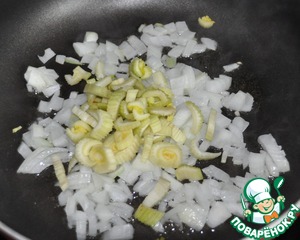 Добавляем нарезанный соломкой стебель сельдерея, обжариваем всё ещё 2 минуты.