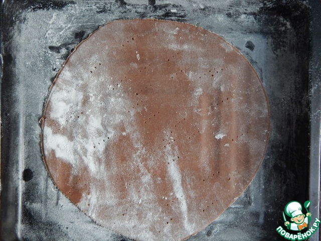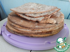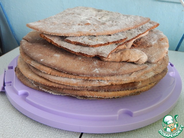 Надо раскатать где-то 8-10 тоненьких коржей (ну так в маминой книге написано, но у меня получается 6-8). Когда будете раскатывать коржи обязательно подсыпайте муку, а иначе прилипнет все к столу, да и на противень потрусите немного муки. Выпекать надо в хорошо разогретой духовки (T=180 С при выпекании).