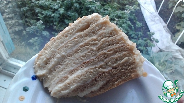 Когда промазала коржи кремом, выросла "башня", которая пыталась уплыть в сторону, потому что крема было много. Зато на следующий день торт хорошо пропитался и таял во рту.