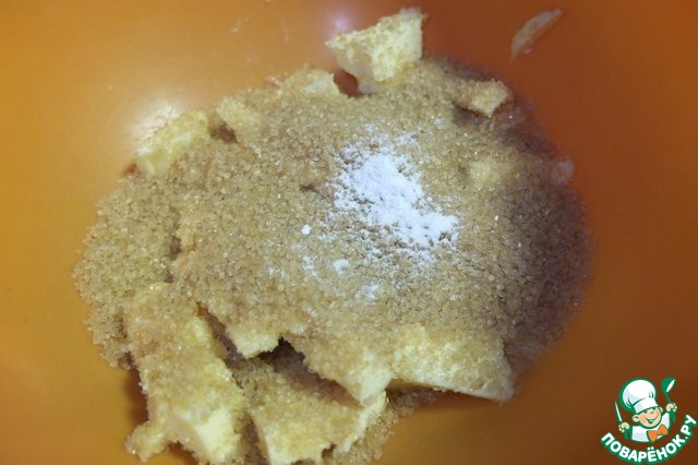 Масло комнатной температуры, яйцо, сахар тростниковый и ваниль смешиваем.