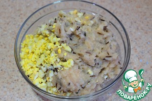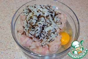 Рис отварить до полуготовности. Соединить рыбный фарш и отварной рис, добавить яйцо. Фарш хорошо вымешать.