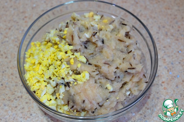 Яйцо отварить, порубить в крошку. Добавить яичную крошку к рыбному фаршу. Все хорошо вымешать.