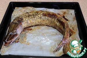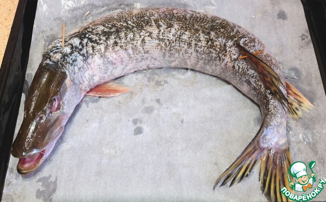Перенести тушку на противень, застланный пекарской бумагой. Соединить нафаршированную тушку рыбы и голову при помощи зубочисток. В нескольких местах сделать проколы кожи, во избежание разрыва при запекании. Запекать в духовом шкафу примерно 40-60 мин. Здесь все будет зависеть от величины щуки.
