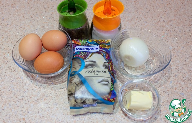 куриные яйца, рис "Мистраль" (смесь дикого и длиннозерного риса), лук репчатый, соль и черный молотый перец, сливочное масло. -