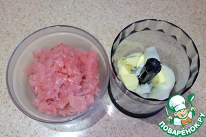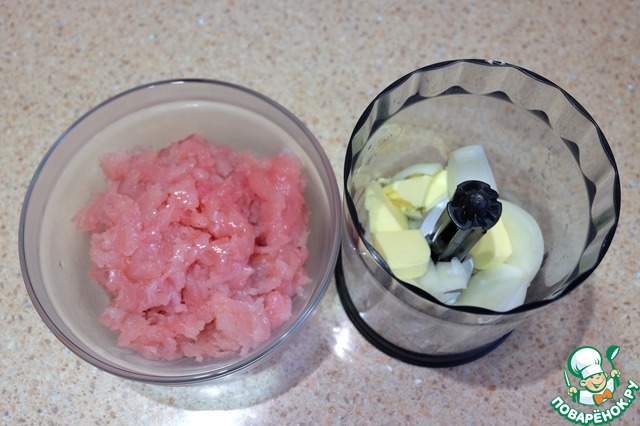 2/3 филе щуки (остальную часть мяса рыбы можно использовать при приготовлении котлет или зраз), сливочное масло, репчатый лук, пробить в блендере до однородного состояния, добавить соль и черный молотый перец по вкусу.