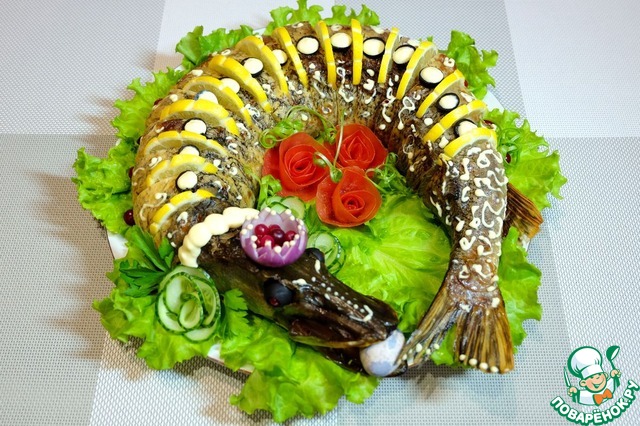 Щуку порезать на порционные кусочки, выложить на блюдо, украсить по вкусу.