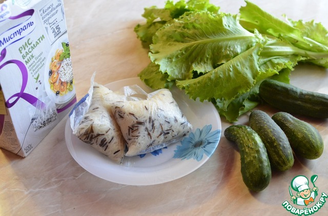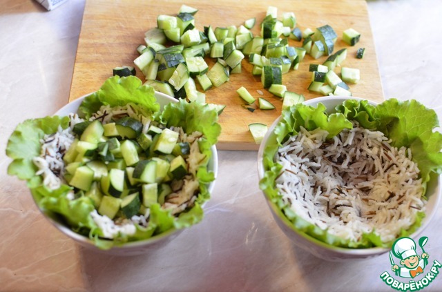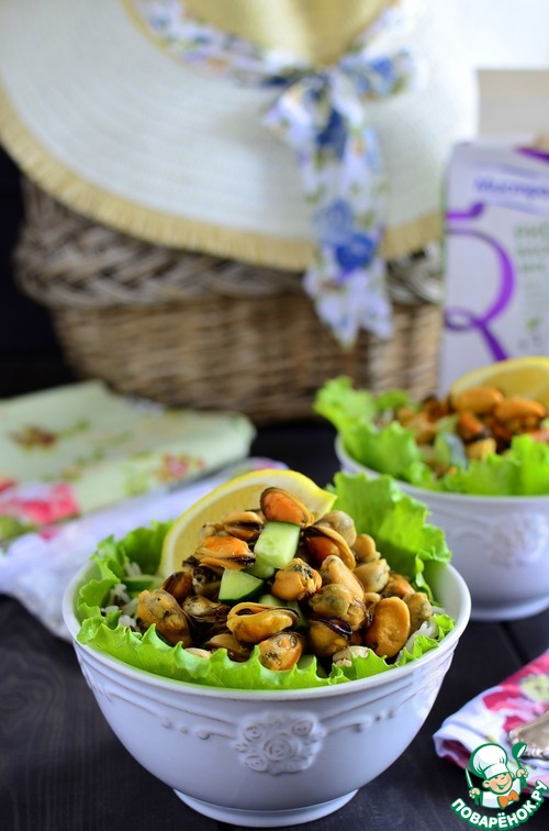 • Охлажденный рис выложить поверх салата и распределить по салатнику, чтобы получилось в рисе углубление. Выложить в углубления огурец, потом охлажденные мидии.