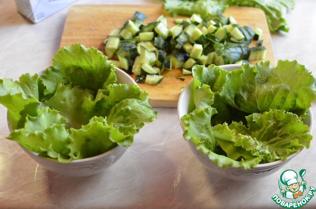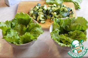 • Вымыть листья салата, обсушить их и выложить в салатницы.