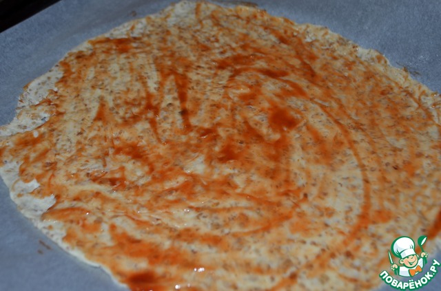 Cмазать тесто тонким слоем кетчупа или любым томатным соусом.