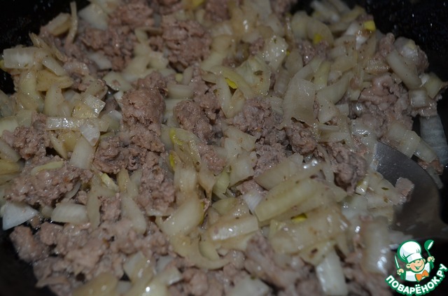 Готовый домашний фарш обжарить вместе с луком на сковороде.
