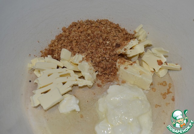 Смешиваем холодное сливочное масло, гречневые хлопья, сметану, соль, муку.