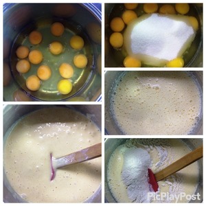 Куриные яйца взбиваем с сахаром, ванильным сахаром и разрыхлителем до получения пышной светлой массы (я взбивала при помощи миксера).
