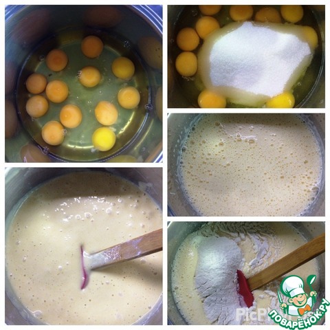 К полученной массе аккуратно добавляем просеянную муку и вмешиваем ее осторожно при помощи лопатки, чтобы взбитые яйца не опали. -