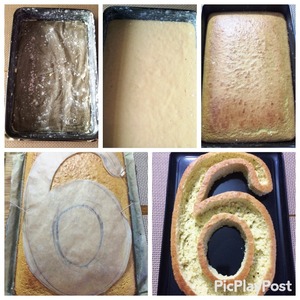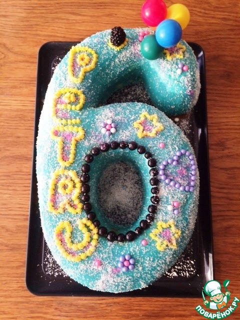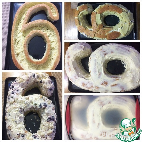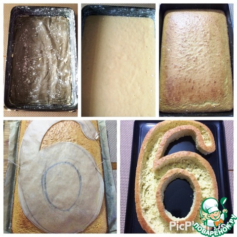 В моем случае, я сначала вырезала из прямоугольного бисквита цифру 6 и уже потом вырезала мякоть. Из круглой формы, куда легче вырезать аккуратно бисквит, который потом нарежем кубиком. -
